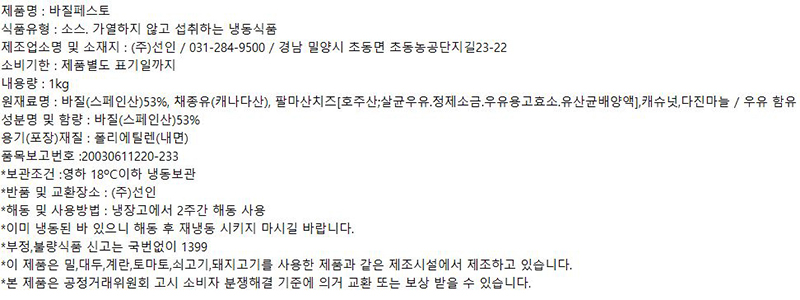 | 제품명 | 바질페스토(1kg/냉동) |