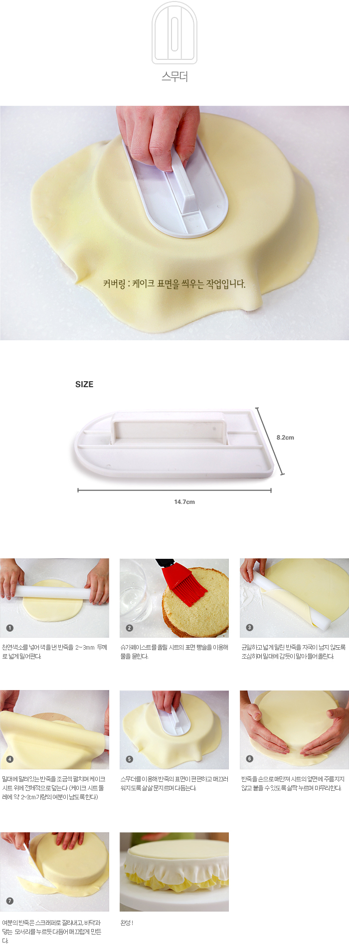 ■ 특징 슈가페이스트로 케익 커버링 시 사용하는 슈가페이스트 스무더입니다.넓은 면적을 커버링할 때 고르고 깔끔하게 감쌀 수 있도록 도와줍니다. ■ 제품 크키 길이 : 14.7cm , 너비 : 8.2cm■ 재질폴리프로필렌
