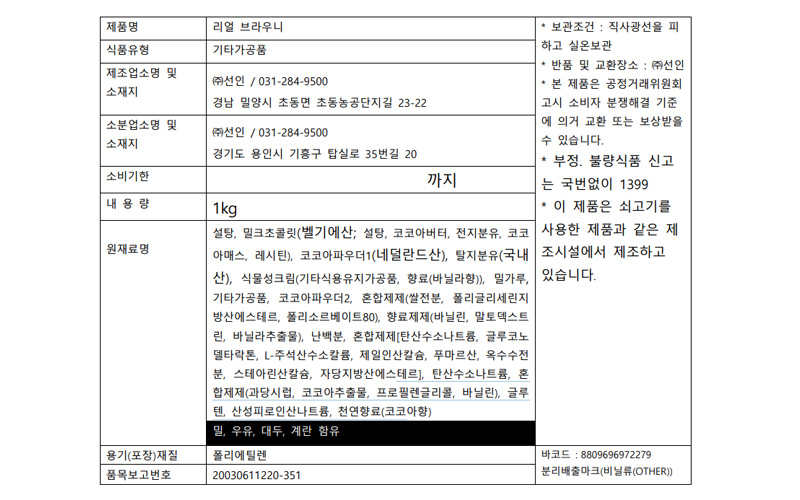 | 제품명 | [주문배송]리얼브라우니(1kg) |