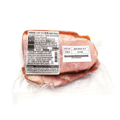 | 원재료명 및 함량 | 프레스햄 100%[이탈리아산:돼지고기(넓적다리살) 78.3%, 정제수, 젖산칼륨, 정제소금, 포도당, 천연향료(후추향), -아스코브산나트륨, 아질산나트륨(발색제), 질산칼륨(발색제) |